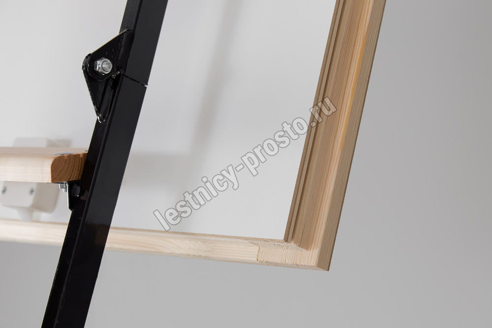 Термоизоляционная крышка имеет усиленную теплозащиту, облицована с двух сторон ДCП белого цвета. В комплекте деревянный стержень для открывания, металлический поручень и защитные накладки на ножки. Лестница идеально подходит для соединения с холодным чердаком.
