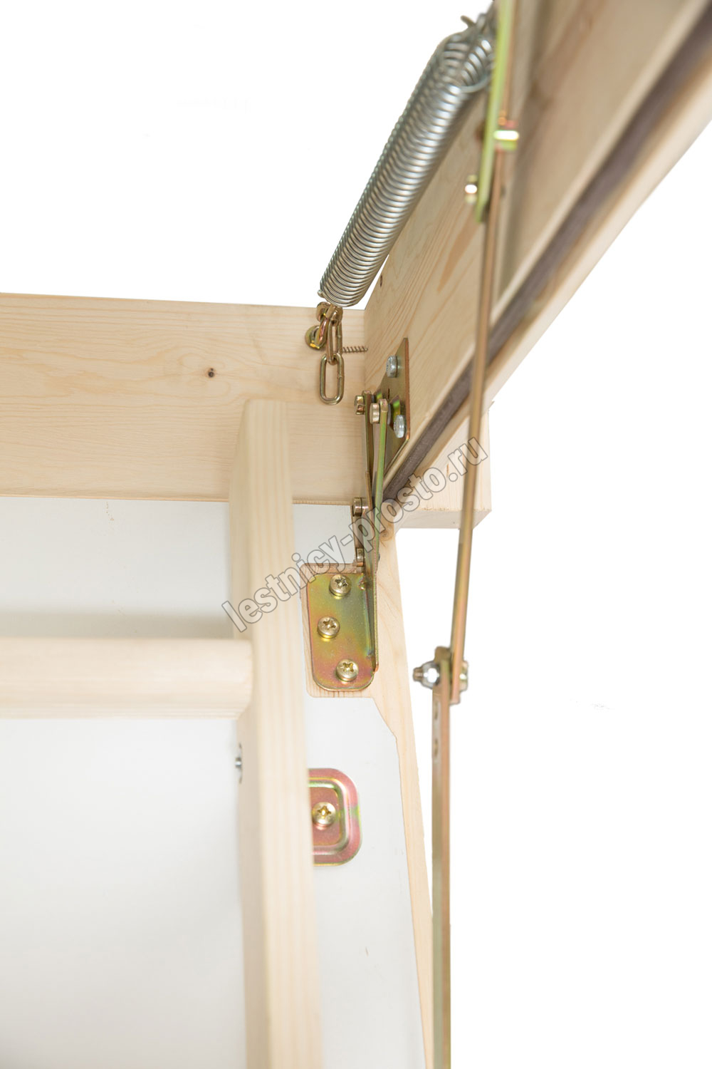 На ступенях лестницы антискользящие насечки. Люк с двух сторон облицован ДСП белого цвета. Размер короба: 900 × 576 мм
