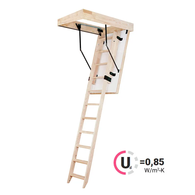 Лестница раздвижная двухсекционная, изготовлена из сосны. Термоизоляционная крышка типа "сэндвич" имеет усиленную теплозащиту, облицована с двух сторон ДСП белого цвета. По контуру короба имеется уплотнитель. Все металлические элементы лестницы покрыты порошковой краской, ступени лестницы имеют антискользящие насечки и закреплены в столярное соединение «ласточкин хвост», что позволяет выдерживать нагрузку 150 кг. При раскладывании лестницы нет вылета за пределы короба, что позволяет использовать эту модель лестницы в таких помещениях, где невозможно использовать чердачные лестницы с большим разбегом открытия. Удобна для эксплуатации на большой высоте. Деревянный стержень для открывания лестницы в комплекте..