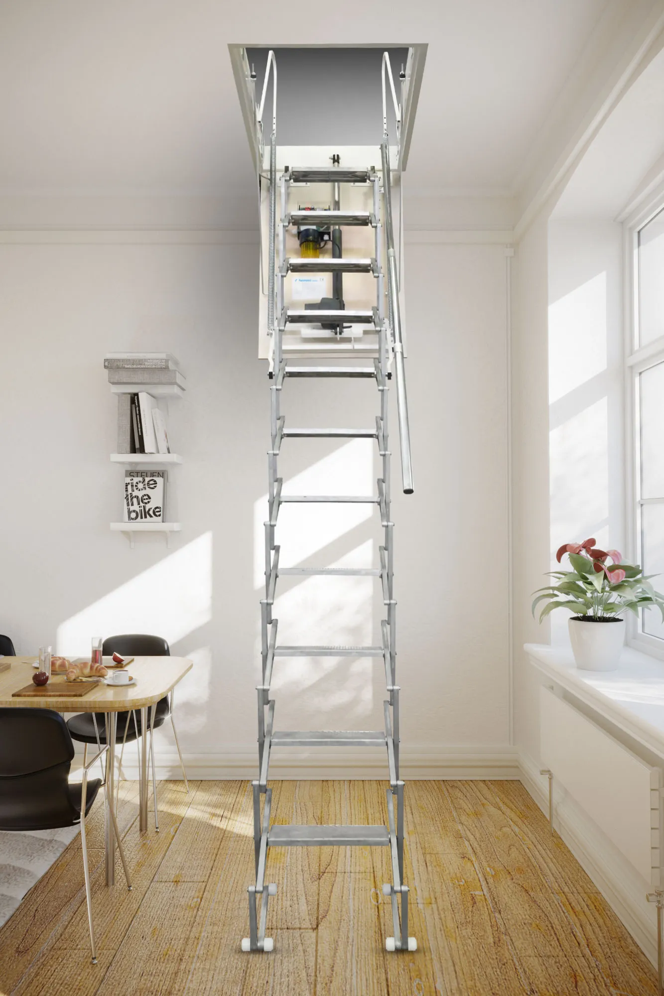 -Возможность установить лестницу как прямую, так и с поворотом внизу или вверху; при этом нужно понимать, что поворот менее удобен, чем прямой участок лестницы.