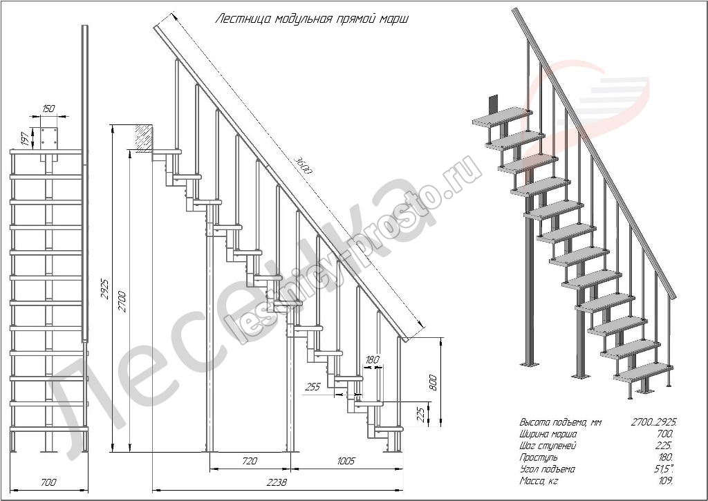 Модульная малогабаритная лестница Линия 2700-2925, Белый, Сосна, Нержавеющая сталь