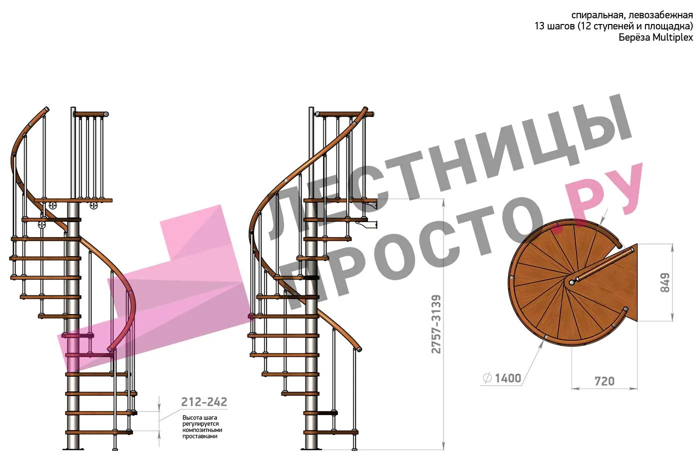 Высота ступеней регулируется с шагом 3 мм. в пределах 212-242 мм., благодаря чему, лестница прекрасно подгоняется под необходимую высоту.
